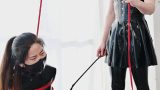 今度は垂直に伸びる鉄棒の前に座る形で固定されたヨーヨー。タイトなエナメルコスチュームがより肉に食い込んでいるように見えます。一見楽そうに見える座った形での調○だが、両足首・両腿・首と両手首という可動域がとことん固定され、予想以上の苦痛が彼女を襲う。その状態からさらに、マスターは非情にも頭にビニール袋をかぶせ…。